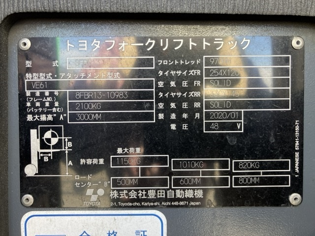 Xe nâng điện cũ đứng lái 1.3T TOYOTA 8FBR13, hàng đã qua sử dụng (Nhật Bản) sản xuất 2020, mã xe TV.E210-TS
